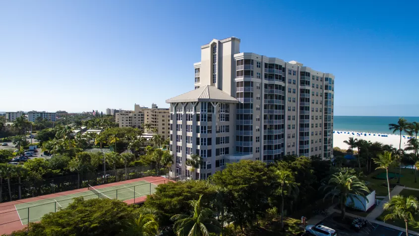 A contemporary beachfront resort, featuring spacious, impeccably-appointed 1-, 2- and 3-bedroom suites, an outdoor heated pool and jacuzzi, fitness room, elevated tennis court, barbecue grilling deck, guest bicycles, and breathtaking views of the Gulf of Mexico.